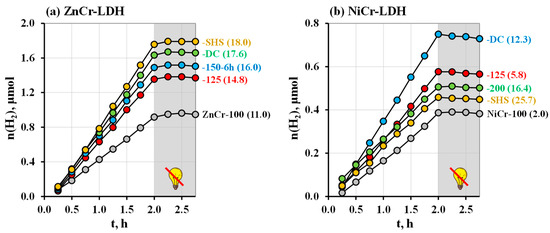 The hydrothermally synthesized LDHs with various average crystallite sizes have been investigated as photocatalysts of hydrogen evolution from 1 mol. % aqueous methanol under both ultraviolet and purely visible irradiation. The kinetic curves obtained under ultraviolet light (Figure 7) demonstrate linear behavior, pointing to the stable hydrogen generation rate maintained throughout the whole measurement time. When the lamp is turned off, the curves reach a plateau corresponding to a zero reaction rate.