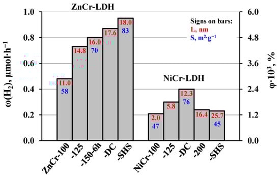 The photocatalytic activity in the reaction of hydrogen evolution from 1 mol. % aqueous methanol was studied for 5 samples of each LDH with a different crystallite size (Table 2). The experiments were carried out under both ultraviolet irradiation (DRT-125 mercury lamp, 125 W, λ > 220 nm) and purely visible light (LED source, 100 W, λ = 425 nm) in the photocatalytic laboratory setting used in our previous reports [98,102,103,104,105,106,107,108,109] and described in detail in Information S1. The spectra of the light sources are shown in Figure S4. The photocatalytic performance of the samples was evaluated in terms of the hydrogen evolution rate ω and apparent quantum efficiency φ.