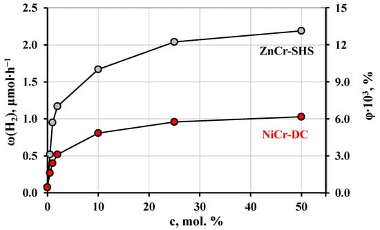 The photocatalytic performance of two most active samples (ZnCr-SHS and NiCr-DC) was additionally evaluated in the methanol concentration range of 0–50 mol. %. Corresponding hydrogen evolution curves are shown in Figure S3. The concentration dependences obtained (Figure 9) are consistent with the standard Langmuir–Hinshelwood model for heterogeneous catalysis [86]: the hydrogen evolution rate increases sharply with the increasing methanol content in the low-concentration area and asymptotically approaches its maximum value in the high-concentration area. This behavior of the graphs is conventionally explained by the gradual filling of active centers on the catalyst surface with adsorbed reactants. In the low-concentration range, most of the active sites are vacant and the catalyst’s performance remains untapped. In the high-concentration region, on the contrary, practically all the active sites are occupied and the reaction rate cannot be boosted via the supply of excess reactants to the catalyst surface.