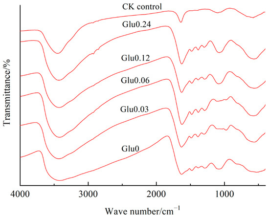 As summarized in Table 1, the absorption intensity of the peak at 3431~3438 cm−1 in HLA increased to different extents when Maillard precursors were exogenously added, compared to the CK control. This increase was attributed to the presence of stretching vibrations from the –OH groups in gibbsite or interlayer water molecules, as well as from the hydroxyl –OH groups in alcohol or phenolic compounds in the HLA. The combined effect of these vibrations resulted in a higher intensity of the peak at 3431~3438 cm−1 compared to the CK control. In comparison to the CK control group, the HLA sample treated with exogenous precursors exhibited an increased peak intensity at 1626~1635 cm−1 and a decreased intensity at 1385~1387 cm−1. This suggested a higher proportion of aromatic C structures and a lower amount of carboxyl groups. The addition of glucose, as well as its increasing concentration, led to a gradual increase in the vibration intensity of the absorption peak at 1090~1117 cm−1, representing polysaccharides. Additionally, there was an elevated vibration frequency of the absorption peak at 611~670 cm−1 due to the formation of Al–O bonds. Consequently, the absorption peaks at 1481~1483 cm−1 and 1288~1302 cm−1 showed varying degrees of decrease with the addition of glucose in each treatment. This indicated that the polyphenol–Maillard reaction resulted in varying degrees of reduction in the levels of carboxyl and phenolic groups in the HLA.