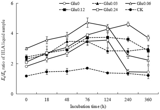 Figure 6 illustrates the trends in E4/E6 ratios for HLA derived from different treatments and CK control. They demonstrated an initial increase followed by a decrease during the incubation period. In the Glu0 treatment, the E4/E6 ratio for HLA increased from 1.82 to 3.56 within the first 124 h and then decreased to 1.44 by the end of the incubation. For the Glu0.03 treatment, the E4/E6 ratio increased from 2.30 to 3.47 over the initial 76 h, remained stable with some fluctuations, and eventually reached 2.99 at the completion of incubation. In the Glu0.06 treatment, the E4/E6 ratio for HLA increased from 3.00 to 4.72 within the first 76 h, gradually declining to 2.23 by the end. In the Glu0.12 treatment, the E4/E6 ratio increased from 2.44 to 3.74 in the first 124 h, before stabilizing at 2.85. Under the Glu0.24 treatment, the E4/E6 ratio rose from 2.10 to 4.61 over 240 h, eventually settling at 3.71. In the CK control group, the E4/E6 ratio increased from 1.18 to 1.70 in the first 76 h and then decreased to 1.22 by the end of the incubation period. At the end of the 360 h incubation, compared to the initial readings, the E4/E6 ratios for HLA from Glu0 and Glu0.06 decreased by 21.0% and 25.6%, respectively, while those from the Glu0.03, Glu0.12, and Glu0.24 treatments and the CK control increased by 30.0%, 16.9%, 76.2%, and 3.4%, respectively. These findings suggested that the absence of glucose or glucose at a concentration of 0.06 mol/L was most effective in promoting the aromatic condensation of HLA molecules. Conversely, glucose concentrations of 0.03, 0.12, and 0.24 mol/L were found to decrease the aromatic condensation of HLA molecules.