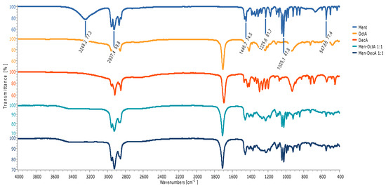 The stretching band of the C=O group is observed at the position of 1710 cm−1 in the spectrum of the mixture Men-OctA 1:1, which represents a bathochromic shift to the same band of pure octanoic acid (1706 cm−1). Such changes may originate from the influence of nearby electron clouds of menthol, which are spatially located near the carbonyl group of the acid [22].