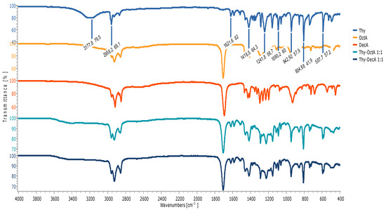 A shift and decrease in the intensity of the peak originating from the stretching vibration of the carbonyl group of decanoic acid from 1694 cm−1 to 1711 cm−1 in the Men-DecA 1:1 are observed, indicating the formation of hydrogen bonds. As represented in Figure 2, all thymol-based HDESs also reflected shifts in the initial OH stretching band of their HBA (thymol) from 3177.8 cm−1 to 34,178 cm−1 in Thy-DecA, while in Thy-OctA, the OH stretching band shifted to 3406.8 cm−1. Also, there were shifts from the initial C=O bands in decanoic acid from 1694.2 cm−1 to 1707.6 cm−1 in Thy-DecA, while Thy-OctA maintained its original C=O band peak but had an increase in its intensity. The results obtained were compared with and validated by previous studies, which showed similar shifts to higher wavelengths for the OH band of the monoterpene and the CO bands of the organic acid, thus depicting interactions between the components, which resulted in the formation of DESs [23,24,25].