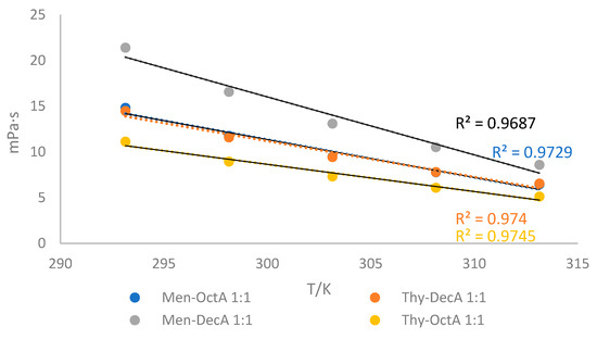 Viscosity values (η) as a function of temperatures in interval T = 293.15–313.15 K for investigated hydrophobic deep eutectic solvents.