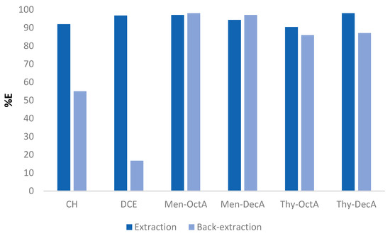 To verify whether the selected hydrophobic DESs are capable of extracting metal ions from the aqueous solutions, this study employed model systems that contained buffered aqueous solutions of Pb(II) ions (accompanied with coexisting cations), as well as hydrophobic solvents prepared prior to experiments. The mechanism and factors that affect the selective extraction of Pb(II) ions were investigated, i.e., the type and volume of solvent used, the concentration of coexisting ions in the feed solution, and the equilibrium time of extraction. Treatment of model systems with solvent volumes less than 2 mL resulted in significantly reduced extraction efficiency compared to treatment of systems with DES volumes of 5 mL, carried out under the same conditions. Considering that concentration gradients are driving forces in mass transfer, these results are consistent with the principles of mass transfer. The extraction efficiencies were slightly lower but still higher than 80% when volumes of 3 mL and 4 mL of solvent were used. Considering that reducing the amount of solvent did not significantly change the amount of removed ions, 3 mL was chosen as the optimal parameter for further experiments. To emphasize the advantage of the proposed method for the extraction of Pb(II) ions, we make a comparison with the results of conventional liquid–liquid extraction with chloroform (CH) and 1,2-dichloroethane (DCE) as solvents. The results obtained from this research are shown in Figure 4. A comparison was made between the results obtained using the HDES solvents and with equimolar concentrations of analyte ions and counter ions within the feed solution, as well as in the conventional LLE procedure with CH and DCE solvents. However, to obtain satisfactory extraction efficiency, conventional hydrophobic solvents required 120 min of mixing at 300 rpm, and comparable results for HDESs were achieved after only 15 min. Actually, the highest extraction efficiency for Thy-DecA solvent (98%) was achieved, compared to other HDESs as well as CH and DCE. The extraction efficiency rate decreases in the order of Men-OctA (97%) > Men-DecA (94.3%) > Thy-OctA (90.3%). In the back-extraction procedure, we used ethylenediaminetetraacetic acid (EDTA) as a stripping agent. EDTA has a strong complexing ability with Pb(II) ions. Back-extraction efficiency was higher for all HDESs used compared to conventional solvents.