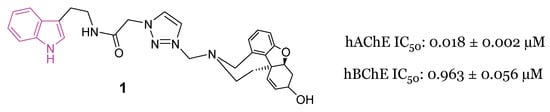 - Chalupova, K.; Korabecny, J.; Bartolini, M.; Monti, B.; Lamba, D.; Caliandro, R.; Pesaresi, A.; Brazzolotto, X.; Gastellier, A.J.; Nachon, F.; et al. Novel Tacrine-Tryptophan Hybrids: Multi-Target Directed Ligands as Potential Treatment for Alzheimer’s Disease. Eur. J. Med. Chem. 2019, 168, 491–514. [Google Scholar] [CrossRef]
