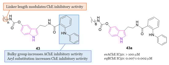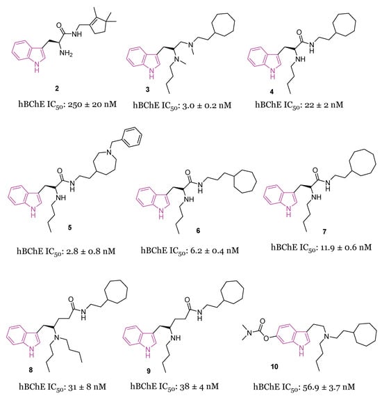 ![]() | Tryptophan analogue ChE inhibitor | hBChE | hBChE IC50: 22 nM | Improvement in long-term memory and spatial long-term memory retrieval in AD mouse model | High permeability across the BBB | Alzheimer disease | [36] |