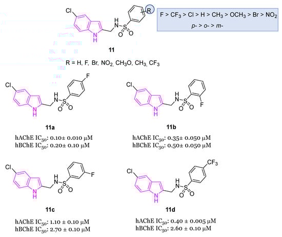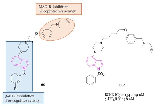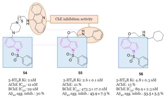 ![]() | Multifunctional 1-(phenylsulfonyl) -1H-indole hybrid | BChE 5-HT6R Aβ agg. | BChE IC50: 89.9 nM 5-HT6R Ki: 4.8 nM Aβ42 agg. inhib.: 53.5 % | Not carried out yet | Effectively penetrates the BBB | [76] | |