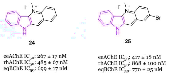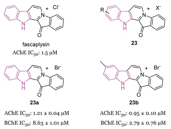 ![]() | Multifunctional fascaplysin derivative | ChEs | AChE IC50: 0.95 µM BChE IC50: 2.79 µM reduced neurotoxicity in the nanomolar range | Improve cognitive impairment in mice, without impacting locomotor functions | Capability to penetrate the BBB, lower in vivo acute toxicity than fascaplysin | Alzheimer disease | [88] |