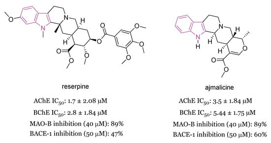 - Kashyap, P.; Kalaiselvan, V.; Kumar, R.; Kumar, S. Ajmalicine and Reserpine: Indole Alkaloids as Multi-Target Directed Ligands Towards Factors Implicated in Alzheimer’s Disease. Molecules 2020, 25, 1609. [Google Scholar] [CrossRef]