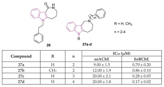 - Purgatorio, R.; de Candia, M.; Catto, M.; Carrieri, A.; Pisani, L.; De Palma, A.; Toma, M.; Ivanova, O.A.; Voskressensky, L.G.; Altomare, C.D. Investigating 1,2,3,4,5,6-Hexahydroazepino[4,3-b]Indole as Scaffold of Butyrylcholinesterase-Selective Inhibitors with Additional Neuroprotective Activities for Alzheimer’s Disease. Eur. J. Med. Chem. 2019, 177, 414–424. [Google Scholar] [CrossRef]