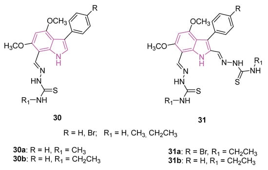- Yıldız, M.; Bingul, M.; Zorlu, Y.; Saglam, M.F.; Boga, M.; Temel, M.; Koca, M.S.; Kandemir, H.; Sengul, I.F. Dimethoxyindoles Based Thiosemicarbazones as Multi-Target Agents; Synthesis, Crystal Interactions, Biological Activity and Molecular Modeling. Bioorg. Chem. 2022, 120, 105647. [Google Scholar] [CrossRef]
