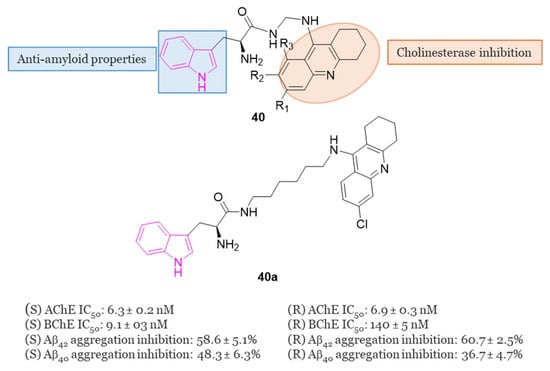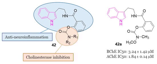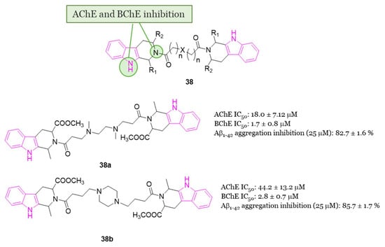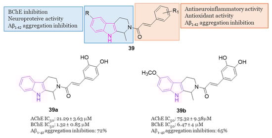 ![]() | Multifunctional cinnamic acid- β-carbolines hybrids | ChEs Aβ agg. | 39a BChE IC50: 1.32 μM 39b BChE IC50: 6.47 μM non-neurotoxic effects, in PC12, SHSY5Y, BV-2, HT22, and L02 cell lines. reduced ROS production in BV2 cells | In AD mice model, orally administered 39a and 39b restored learning and memory function | - | Alzheimer disease | [119] |