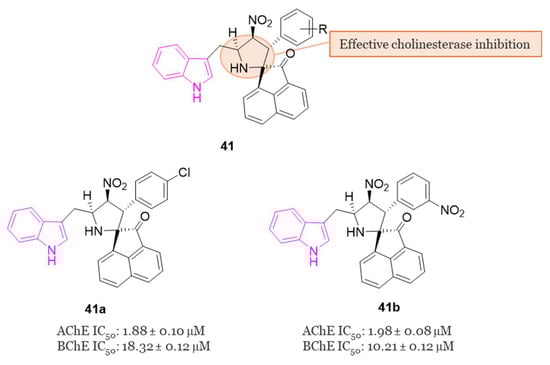 - Arumugam, N.; Almansour, A.I.; Suresh Kumar, R.; Altaf, M.; Padmanaban, R.; Sureshbabu, P.; Angamuthu, G.; Kotresha, D.; Manohar, T.S.; Venketesh, S. Spiropyrrolidine/Spiroindolizino[6,7-b]Indole Heterocyclic Hybrids: Stereoselective Synthesis, Cholinesterase Inhibitory Activity and Their Molecular Docking Study. Bioorg. Chem. 2018, 79, 64–71. [Google Scholar] [CrossRef] [PubMed]