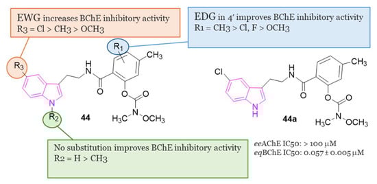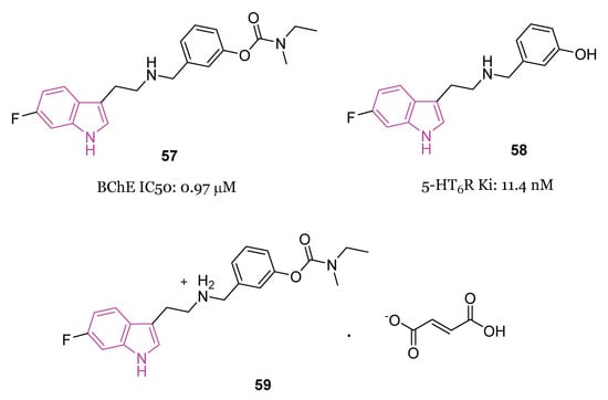 ![]() | Multifunctional carbamate -tryptamine hybrid | BChE 5-HT6R | BChE IC50: 0.97 μM. 5-HT6R Ki: 11.4 nM | Ability to reverse memory deficits induced by scopolamine in vivo | Favorable druggability characteristics | Alzheimer disease | [77] |