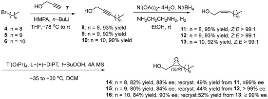 Our synthesis began with the preparation of chiral epoxy alcohols 14–16, as depicted in Scheme 2. According to the procedure reported by Dallavalle [16], the alkylation of propargyl alcohol 7 with 1-bromononane (4) provided dodec-2-yn-1-ol (8) in excellent yield. Subsequently, the pure cis-selective product (11) was generated (95% yield, Z:E > 99:1) through the reduction of the alkyne bond in 8 with Brown’s catalyst P2-Ni [17,18]. The next process was the crucial step in this transformation, which introduced chiral epoxy alcohol to primary allylic alcohol 11 via asymmetric Sharpless epoxidation. The synthesis of ((2S,3R)-3-nonyloxiran-2-yl) methanol (14) was accomplished (82% yield, 88% ee), catalyzed by L-(+)-diisopropyltartrate and Ti(OiPr)4 [19,20]. After one recrystallization using petroleum ether, the ee value of 14 increased to over 99%, which was determined via the 1H NMR analysis of the Mosher ester of 14 [20,21]. Similarly, using primary bromides 5 and 6 as starting materials, respectively, desired chiral blocks 15 and 16 could be obtained through the above-mentioned synthesis process of 14. The enantiomeric purity of 15 and 16 could also be improved to up to 99% after recrystallization with petroleum ether.