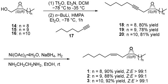 With chiral epoxy alcohols in hand, we focused on the synthesis of the target pheromones 1–3, as outlined in Scheme 3. The hydroxyl group in 14 was activated by treating with trifluoromethanesulfonic anhydride to afford a corresponding triflate. Then, the alkynylation coupling reaction between the in situ-generated triflate and 17 was undertaken, offering the desired epoxy alkyne 18 in 80% yield [22]. Following a similar procedure, corresponding epoxy alkynes 19 and 20 were afforded with good yields. Finally, the cis-selective reduction of 18, 19 and 20 produced the corresponding target compounds 1 (90% yield, Z:E > 99:1), 2 (88% yield, Z:E > 99:1) and 3 (92% yield, Z:E > 99:1), respectively [17,23]. It is noteworthy that we employed the alkynylation/reduction approach to synthesize compounds 14–16 into target pheromones 1–3, achieving conversions with yields ranging from 69% to 75% in two steps. This approach has demonstrated high efficiency and straightforward execution. The structures of these three sex pheromones were characterized by 1HNMR, 13CNMR, HRMS and specific rotation (1HNMR and 13CNMR spectras are available in the supplementary materials), which were consistent with the references [4,5].