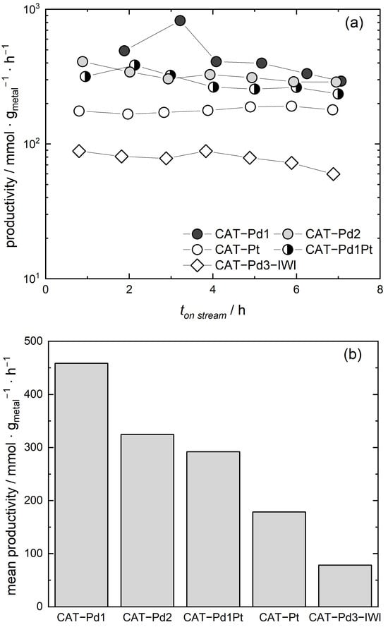| CAT | x10 nm | x50 nm | x90 nm | Δ – | Loading wt% | Mean Productivity mmol · gmetal−1 · h−1 |