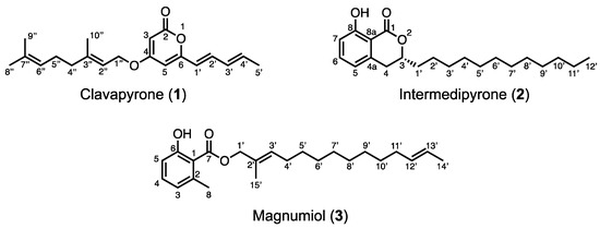 The production of secondary metabolites is highly dependent on the fermentation conditions, which provide the nutrients necessary for growth, such as carbon, nitrogen, and phosphate. Numerous metals such as zinc, iron, and manganese are also essential for bacterial growth, some of which also affect antibiotic production [11]. Cellular slime molds grow by feeding on bacteria, such as Klebsiella aerogenes and Escherichia coli, without requiring medium components, whereas little is known about their growth by feeding on other bacteria [12,13]. In fact, the effect of feeding bacteria on the production of secondary metabolites is unknown. Recently, our group isolated monochasiol F and G from D. monochasioides fed with K. aerogenes [3]. These resorcinols contain unusual alkyl chains with a cyclopropane moiety. The origin of this substructure is considered to be lactobacillic acid, which is widely present in some bacteria. This result shows that coincubating bacteria directly affects the second metabolites of cellular slime molds [3]. Here, we describe the structural elucidation of clavapyrone (1), intermedipyrone (2), and magnumiol (3), which were newly isolated from D. magnum, D. clavatum, and D. intermedium, respectively, and cultured with bacteria of the genus Pseudomonas instead of the one that is normally used (Figure 1).