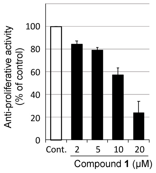 Next, we investigated the biological activities of the isolated compounds 1 and 2. Compound 1 exhibited moderate antiproliferative activity against human leukemia K562 cells (IC50 17 μM, Figure 5), whereas compound 2 did not inhibit K562 cells, human cervical cancer HeLa cells, and mouse 3T3-L1 fibroblast cells (a model nontransformed cell line) (IC50 > 20 μM). Compounds 1 and 2 at concentrations of up to 100 μM did not show apparent antibacterial activities for Gram-positive (Staphylococcus aureus) and Gram-negative (E. coli) bacteria. Studies on the biological activities of 3 are currently underway.