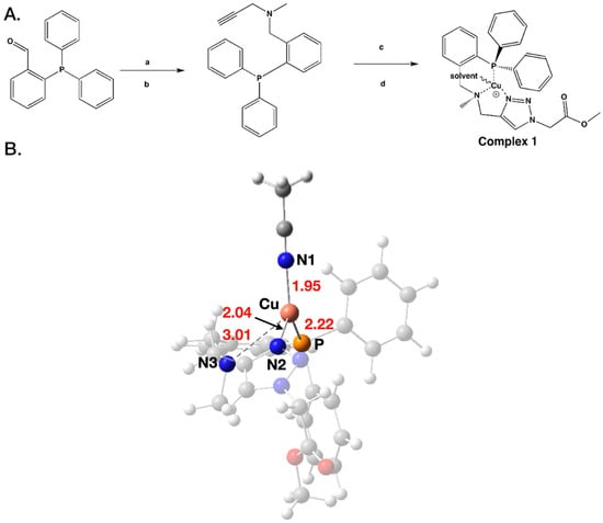Synthesis and structure of Complex 1. (A) Scheme showing the synthesis of the ligand. (a) Condensation of 2-(diphenylphosphaneyl)benzaldehyde (PBA) to imine with N-methyl propargylamine (mPA), MeOH, rt, 52 h, mPA:PBA 5:1. (b) Reduction with NaBH3CN (imine:NaBH3CN 1:4) pH 5.0–5.5, 3–24 h (c) Complexation of ligand with tetrakis(acetonitrile)copper(I) hexafluorophosphate (1.2:1.0 equivalents) in acetonitrile, 5 h; (d) In-solution click reaction of complexed ligand with methyl 2-azidoacetate, rt, 24 h. (B) Optimized structure of Complex 1, employing DFT. In the optimized structure, Cu (shown in coral) is coordinated with nitrogens N1, N2, N3 (blue), and phosphorus P (orange). Oxygens in the ligand framework are shown in red, while nitrogens are denoted in blue. Cu, N1, N2, and P are in the same plane. Cu-N1 (1.95 Å) and Cu-N1 (2.04 Å) bond distances are relatively shorter compared to Cu-N3 (3.01 Å).