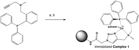 Immobilization of ligand on solid support to yield immobilized Complex 1. a. Ligand: [Cu(CH3CN)4]+ PF6− (1.2:1.0 equivalents) in acetonitrile (ACN), 5 h; b. 1 equivalent ligand and 4 equivalents DIEA, added to 1 equivalent resin-bound azide, rt, 72 h, followed by ACN washes.