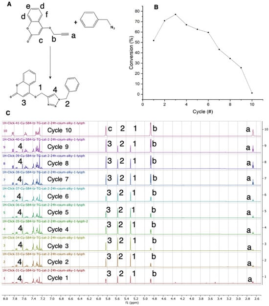 Repeated use of immobilized Complex 1 for the CuAAC reaction yields Triazole 3 without recharging the complex with copper. (A) Reaction scheme and labeled protons in alkyne and triazole; a–f refer to protons of the starting material alkyne, and 1–4 refer to the protons of the product triazole. (B) Percentage of Triazole 3 formation in cycles 1–10; (C) 1H-NMR of cycles 1–10.