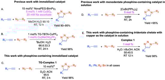 Comparison of this work with previously reported catalysts for CuAAC reaction. (A) Fokin et al. [17] utilized additional copper (I) complex in the catalysis reaction. (B) Finn et al. [15] used free copper (II) and the reducing agent sodium ascorbate in the catalysis reaction. (C) The immobilized complex described in this article catalyzes without free copper and reducing agents. (D) Diez-Gonzales et al. [6] used the Cu(I) complex with a monodentate phosphine-containing ligand as a catalyst in solution. (E) The developed complex described in this article can work in solution as a CuAAC catalyst at a lower mol%. See Supplementary Materials for the mol percentage calculations of immobilized catalyst (*, #).