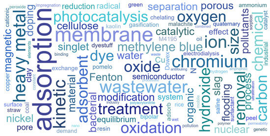 According to the publication status of the Special Issue, 34 publications have been released, including 4 reviews, 2 communications, and 28 full-length research articles. Focused on the theme of the Special Issue, the publications have reported a series of functional adsorption materials, ion sieves, and oxidation/reduction materials for typical contaminants such as salts, heavy metals, radioactive nuclides, soluble organic pollutants, and oils. Additionally, they have reported on related technologies such as adsorption, ion exchange, oxidation, reduction, oil–water separation, reverse osmosis, and electrodialysis. To deepen readers’ understanding of this Special Issue, we have also created a word cloud based on the keywords of the 34 papers in the Special Issue, as shown in Figure 1.