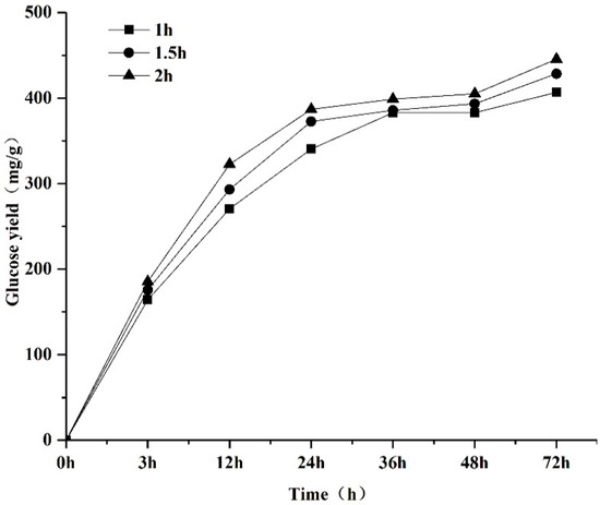 Pretreatment of the samples with the NaOH solution with a concentration of 5% for 1 h was the first step, and IL pretreatment for different durations was the second step. As can be seen in Figure 1, 72 h after the enzymatic hydrolysis, the final glucose yield from the MDF after 1 h AAI pretreatment was 406.8 mg/g; then, the pretreatment time was extended to 1.5 h, which led to an increase in the glucose yield from MDF conversion to 428.4 mg/g. The prolongation of the pretreatment time to 2 h resulted in the highest glucose yield of 445.5 mg/g. A series of studies were conducted to explore the potential mechanism of AAI pretreatment, as described below.
