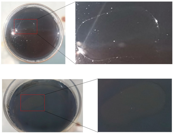 After NaOH pretreatment, oily substances were detected on the liquid surface of the sintered glass filter after the separation of the MDF powder from the NaOH solution (Figure 2). The same pretreatment for preparing MDF hot-mill fiber (HMF) did not yield such oily substances. According to the production process for fiberboard, it is speculated that the observed oily substances may be composed of a waterproof agent (paraffin, rosin) or an oily flame retardant or preservative.
