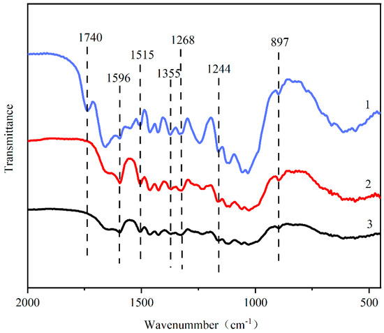 FT-IR spectra of the raw MDF, NaOH-pretreated, and AAI-pretreated MDF: 1—untreated MDF; 2—NaOH pretreated; 3—AAI pretreated.