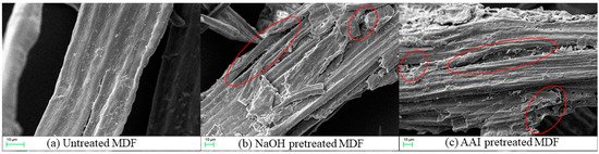 SEM images of (a) untreated MDF; (b) NaOH-pretreated MDF; (c) AAI-pretreated MDF.
