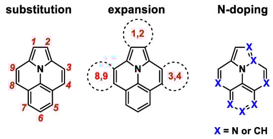 Ullazine contains 16-π-electrons, is isoelectronic to pyrene, and is a representative of polycyclic heteroaromatic hydrocarbons (PAHs) [1]. It has been known since its first synthesis in 1983 [2], but has gained much interest for applications in organic electronics during the last decade [1,3,4,5,6,7] since Grätzel et al. disclosed its promising application in dye-sensitized solar cells in 2013 [1]. The aromatic 14-π-electron resonance structure is a key factor, consisting of an electron-accepting iminium center surrounded by an electron-donating annulene. Hence, in the following years, several approaches, such as substitution, π-extension or heteroatom doping, were employed to modify the properties of various applications. Substitutions on the ullazine core are known in each position (1–9) of the ullazine core (Figure 1) [1,2,8,9,10,11,12]. Positions 4, 5, and 7 can be addressed by electrophilic substitution, whereas position 5 is the most active of these three [1,13,14]. Functionalization on the other positions can be achieved through the employment of suitable precursors during ullazine formation, for example, by the double benzannulation of N-phenylpyrroles [1,2,8,9]. The expansion of the π-systems is mainly executed by 1,3-dipolar cycloaddition with azomethine ylides, which leads to symmetrical dibenzoullazines with functionalization of positions 1 and 2 [15,16,17,18,19,20]. Fused dithieno- and dipyridoullazines are obtained by the photochemical cyclization of 3,9-diarylullazines [21]. In addition to the extension of the π-system and variations in the substitution pattern, doping of the scaffold by heteroatoms has been used to alter the inherent properties of ullazines. Several examples of N-, O-, and B-doped ullazines are known in the literature [9,22,23,24,25,26,27,28,29].
