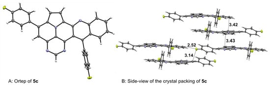Crystals of 5c were grown via the slow evaporation of its chloroform solution, making them suitable for X-ray crystal structure analysis (Figure 2) [35]. The obtained crystal structure contained two co-crystallized CHCl3 molecules per unit cell, which were omitted for better illustration. Both p-tolyl residues were twisted out of plane from the core structure by dihedral angles of 40° on the diazaullazine moiety and 84° on the quinoline part. Moreover, the crystal lattice showed a slipped antiparallel π-π-stacking with a spacing of 3.43 Å and 3.41 Å between the quinoline and diazaullazine entities, respectively. Different stacks within the crystal lattice were stabilized by close F-π (3.14 Å) and F-HC (2.52 Å) contacts.
