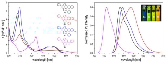 The optical properties were studied via steady-state absorption- and emission spectroscopy (Figure 4). We focused on products 5a, 5k, and 5l, which differ from the substitution pattern directly on the polycyclic scaffold. The impact of the attached phenyl rings on the optical properties is known to be limited due to its twisted orientation, and will not be further analyzed [30,31]. The results will be compared with ACM product 6a. The spectroscopic data are shown in Table S2.