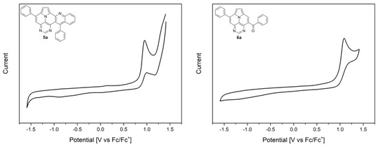 To gain insights into the redox properties of the different core structures, 5a and 6a, we performed cyclic voltammetry (CV) measurements in dichloromethane (Figure 5). Both compounds exhibit an irreversible oxidation potential, while 5a is slightly more easily oxidized (0.95 V; onset potential of 0.85 V) than compound 6a (1.08 V; onset potential of 0.96 V), which corresponds to the experimentally deduced HOMO energies of −5.65 eV (5a) and −5.76 eV (6a) [42]. As expected, the presence of a withdrawing benzoyl group on the ullazine scaffold leads to a lower oxidation potential compared to diazaullazine 8 [29]. Similarly, the exchange of a pyridine ring of 7 with a more electron-poor pyrimidine ring (5a) leads to a reduced oxidation potential (Table 3) [30]. No reduction event is observed within the analyzed potential window of dichloromethane.