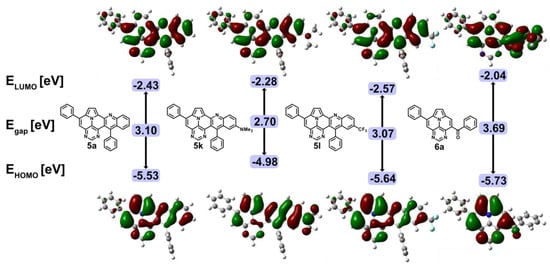 Frontier orbitals of 5a, 5k, 5l, and 6a, and energy levels calculated at the B3LYP/6-31G(d,p) level of theory within IEFPCM in CH2Cl2.