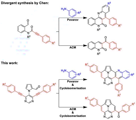 Recently, we studied the synthesis of 5,7-diazaullazines [29]. The incorporation of a pyrimidine ring into the ullazine scaffold leads to strongly altered optical properties through the stabilization of the HOMO and LUMO energies with strong intramolecular charge transfer (ICT) properties and improved quantum yields. Moreover, we reported the synthesis of quinolino-azaullazines, which show bathochromically shifted absorption and emission features compared to their azaullazine subunit or related dibenzoullazines [30]. Hence, we were interested in combining these two approaches, π-expansion and increased N-doping of the ullazine structure, to study the impact of these structural modifications on the photophysical properties. Retrosynthetic analysis revealed that respective quinolino-diazaullazines are accessible by a combination of the Povarov reaction and cycloisomerization, similarly to the synthesis of quinolino-azapyrenes and quinolino-azaullazines [30,31]. Interestingly, the same starting material might also undergo alkyne–carbonyl metathesis (ACM) followed by cycloisomerization for the construction of novel benzoyl-diazaullazine derivatives. Hence, we report a divergent synthesis of quinolino-diazaullazines and benzoyl-diazaullazine from the same precursor through careful choice of the employed reaction conditions. During our studies, the group of Chen reported a related approach for the selective synthesis of pharmaceutically relevant naphthyridinones and quinolinones via either Povarov or ACM reaction, respectively, starting from formyl-phenylpropialamide (Scheme 1) [32].