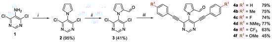 Our synthetic methodology started with the synthesis of an eligible pyrrolopyrimidine 4, which can undergo ACM and Povorav reactions followed by cycloisomerization. Starting from commercially available 4,6-dichloropyrimidin-5-amine (1), the Clausson–Kaas reaction gave pyrrolopyrimidine 2 in excellent yield. Subsequent Vilsmeier–Haak reaction proceeded selectively on the pyrrole ring, resulting in a mixture of the 2- and 3-formylpyrrole derivatives from which the respective precursor 3, with aldehyde function in position 2, was separated in 41% yield. Finally, the desired precursors 4a–f were obtained by two-fold Sonogashira reaction in good yield (Scheme 2) [29,30].