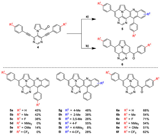 Synthesis of final products 5a–l by Povarov/cycloisomerization and 6a–f by ACM/cycloisomerization. (a) 1. FeCl3 (1 eq.), corresponding aniline (1.2 eq.), xylene, 140 °C, 3 h; 2. p-TsOH∙H2O (30 eq.), xylene, 140 °C, 6 h. (b) p-TsOH∙H2O (20 eq.), xylene, 120 °C, 6 h.