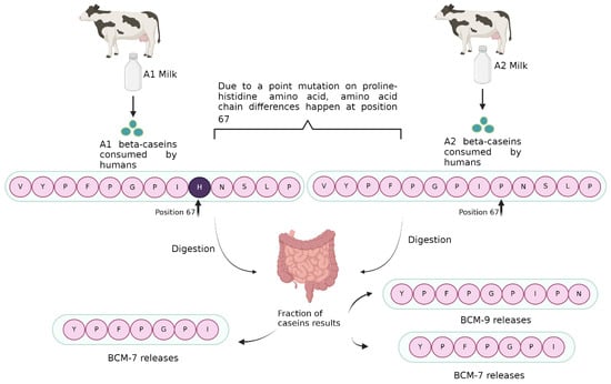 Due to the distinction in the nucleotide code between these β-casein variants, the two variants differ in terms of chemical and biological effects. These effects become noticeable over the long term when a specific type of milk is consumed consistently due to the digestion of the A1 and A2 variants. Upon digestion, two peptides with different structures are released. Digestion from A1 and A1/A2 variant milk yields β-casomorphin-7 (BCM-7), whereas digestion of A2 variant milk releases β-casomorphin-9 (BCM-9) and a low amount of β-casomorphin-7 [8,18]. However, the one-terminal structure of the BCM-7 peptides is not the same as that of A1 milk-derived BCM-7. This may affect the BCM-7’s capabilities like absorption, transport, and binding to opioid receptors [19].