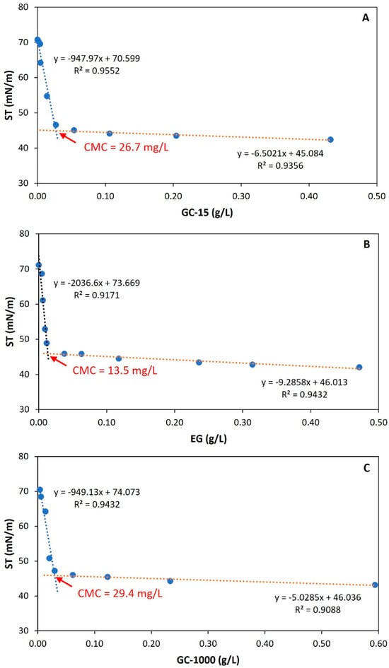Surface tension (ST) and critical micelle concentration (CMC) of gordofactin samples at different purification stages: (A) GC-15—gordofactin concentrate from ultrafiltration by the 15 kDa MWCO membrane; (B) EG—extracted gordofactin (solvent extraction); (C) GC-1000—gordofactin concentrate from ultrafiltration by the 1000 kDa MWCO membrane. Data points represent averages of ten measurements of each replicate (0.06% < SD < 2.63%, SD—standard deviation).