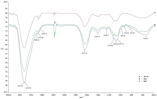 Fourier-transform infrared spectroscopy (FT-IR) is a particularly useful technique for identifying the types of functional groups and the chemical bonds present in a purified fraction of a novel BS/BE sample, contributing to the elucidation of its chemical nature. In this context, the lyophilized GC-15 (from the ultrafiltration step) and the lyophilized EG samples (EG1, EG2—extracted gordofactin samples from two different batches, i.e., replicates) were subjected to FT-IR analysis, and the corresponding spectra are illustrated in Figure 2.