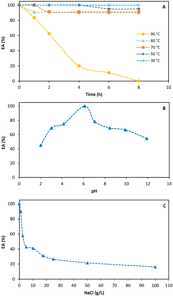Influence of temperature (A), pH (B), and salinity conditions (C) on the emulsifying activity (EA) of extracted gordofactin. For each factor, the results are presented in percentage of EA in relation to the maximum EA, considered 100%.