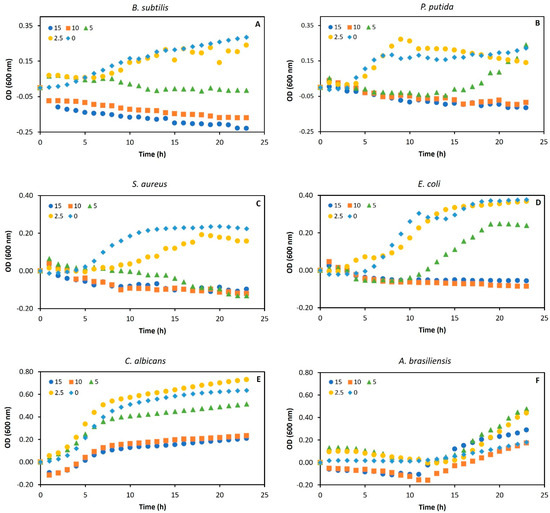Growth profiles of six microbial strains in the presence of different concentrations (0, 2.5, 5, 10, and 15 g/L) of extracted gordofactin (EG) produced by G. alkanivorans strain 1B. Gram-positive bacteria: B. subtilis (A) and S. aureus (C), Gram-negative bacteria: E. coli (B) and P. putida (D), and fungal strains: C. albicans (E) and A. brasiliensis (F). Each graphical point represents the average of at least 3 experimental measurements (SD ≤ 5.0 ± 0.5%). Note: For each time (ti), OD600 = OD600 (ti) − OD600 (t0).