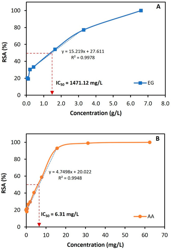 Figure 5 presents the plots of the concentration-dependent radical scavenging activity [% RSA = f(concentration)] for gordofactin (Figure 5A) and L-ascorbic acid (Figure 5B), from which the respective IC50 values were estimated. At a concentration of 52 mg/L, the EG only scavenged 20.4% of DPPH radicals, while L-ascorbic acid achieved the same level of scavenging at a much lower concentration (0.49 mg/L). L-ascorbic acid at a concentration of 7.8 mg/L exhibited a percentage of DPPH RSA of 58.8%, and at 62.5 mg/L, 100%, highlighting its high antioxidant activity. The IC50 value estimated for L-ascorbic acid was 6.31 ± 0.29 mg/L, which is within the range observed in other studies with this reference antioxidant (0.60–98 mg/L) [68,69,70,71]. The IC50 calculated for EG was 1471.12 ± 67.67 mg/L, achieving 100% DPPH radicals scavenging at the concentration of 6600 mg/L (Figure 5A). It is important to point out that the extraction protocol was not optimized to preserve antioxidant activity and mostly considered BS/BE properties. By limiting contact with light or exposure to oxygen, it could be possible to obtain significant improvements. Nonetheless, these results still point to the significant antioxidant capacity of gordofactin. The IC50 values quantitatively describe the radical scavenging affinity. The lower the IC50 value, the higher the DPPH radical-removing ability of the antioxidant. Indeed, IC50 value is widely used in biochemistry to compare the radical scavenging capacities of different antioxidants.