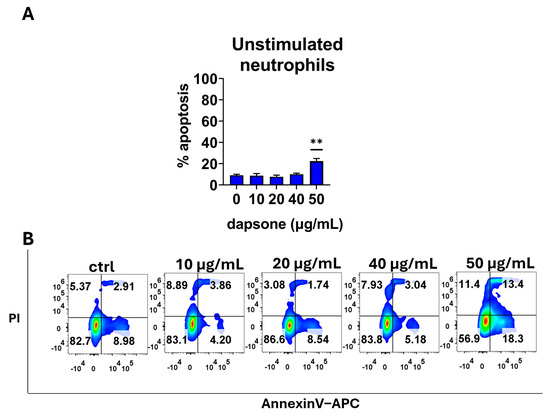 Cytotoxic effect of dapsone on neutrophils. Neutrophils were cultivated alone or with different concentrations of dapsone as indicated for 6 h. Cytotoxicity was evaluated using an Annexin V-APC/Propidium Iodide apoptosis/necrosis assay. (A) The summarized results showing % of apoptosis. Values are given as mean ± SD from 3 independent experiments carried out with different donors. ** p < 0.01 compared to the corresponding control (dapsone-untreated) group. (B) Representative plots of early apoptosis (AnnexineV+), late apoptosis/secondary necrosis (AnnexinV+/Pi+), and primary necrosis (PI+) of neutrophils from one representative experiment. The doublets and the death (FCS low) cells were gated out (see Supplementary Figure S1), and the quadrants were set according to the single-labeled samples.