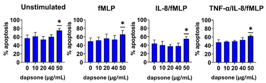 Initially, we assessed the effect of dapsone on neutrophil apoptosis, which is a critical function in resolving inflammation. It is known that neutrophils undergo apoptosis at varying rates in peripheral circulation and inflammation sites. Therefore, we measured the apoptotic rate under different conditions (unstimulated or primed/stimulated) and at different time intervals (after 6 h and 18 h) by using apoptosis/necrosis assays. We found that only the highest concentration of dapsone (50 μg/mL) reduced the viability of both resting (unstimulated) and fMLP-activated neutrophils after 6 h (Figure 1) and 18 h (Figure 2) incubation periods due to an increase in the proportion of apoptotic cells (p < 0.001 or p < 0.05, respectively) compared to corresponding untreated controls. A similar effect was observed when IL-8/fMLP and TNF-α/IL-8/fMLP were used as stimuli. Additionally, the addition of cytokines to fMLP appeared to decrease the spontaneous apoptosis of neutrophils.