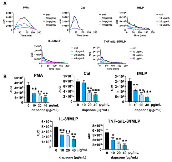 Effect of dapsone on ROS production (A,B). Neutrophils were cultured alone or with dapsone as described in the Materials and Methods section. ROS production was evaluated by measuring luminescence intensity in real time. The values are shown as the area under the curve (AUC). (A) A representative histogram showing real-time ROS production. (B) Summarized results are presented as mean ± SD from 4 independent experiments carried out with different donors. * p < 0.05; ** p < 0.01 and *** p < 0.001 compared with corresponding control (dapsone-untreated) groups.